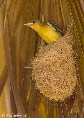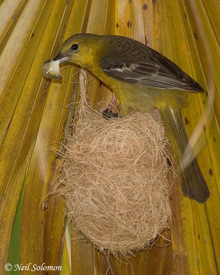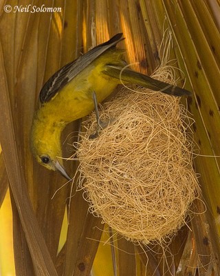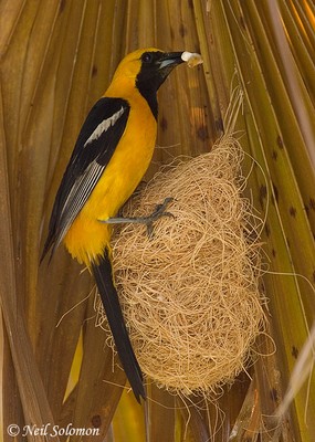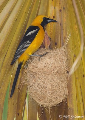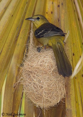 their nests to the underside of fan palm leaves. Only female orioles