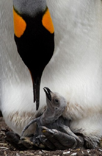 Chicks are totally dependent upon their parents for food and warmth. The parents will feed their chick by eating fish and regurgitating the partly digested food into the chick's mouth. |